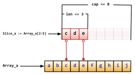 slice开始位置到数组的最后位置的长度Array_a := [10]byte{'a', 'b', 'c', 'd', 'e', 'f', 'g', 'h', 'i', 'j'} Slice_a := Array_a[2:5]上面代码的真正存储结构如下图所示