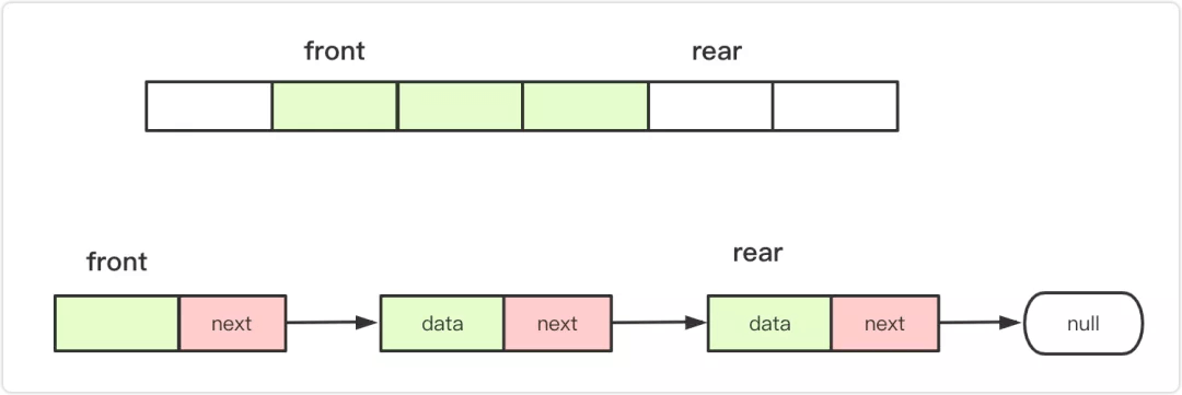 对于数组,队尾tail指向的位置是空的,而链表的front(head一样)为头指针为空的,所以在不同结构实现相同效果的方法需要注意一下。