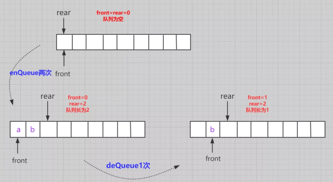 初始化:数组的front和rear都指向0. (front和rear下标相等的时候说明队列为空)
