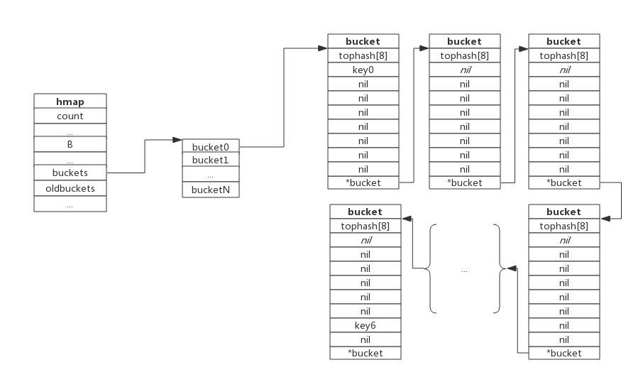 由于每个bucket可以存放8个键值对,所以同一个bucket存放超过8个键值对时就会再创建一个键值对,用类似链表的方式将bucket连接起来。